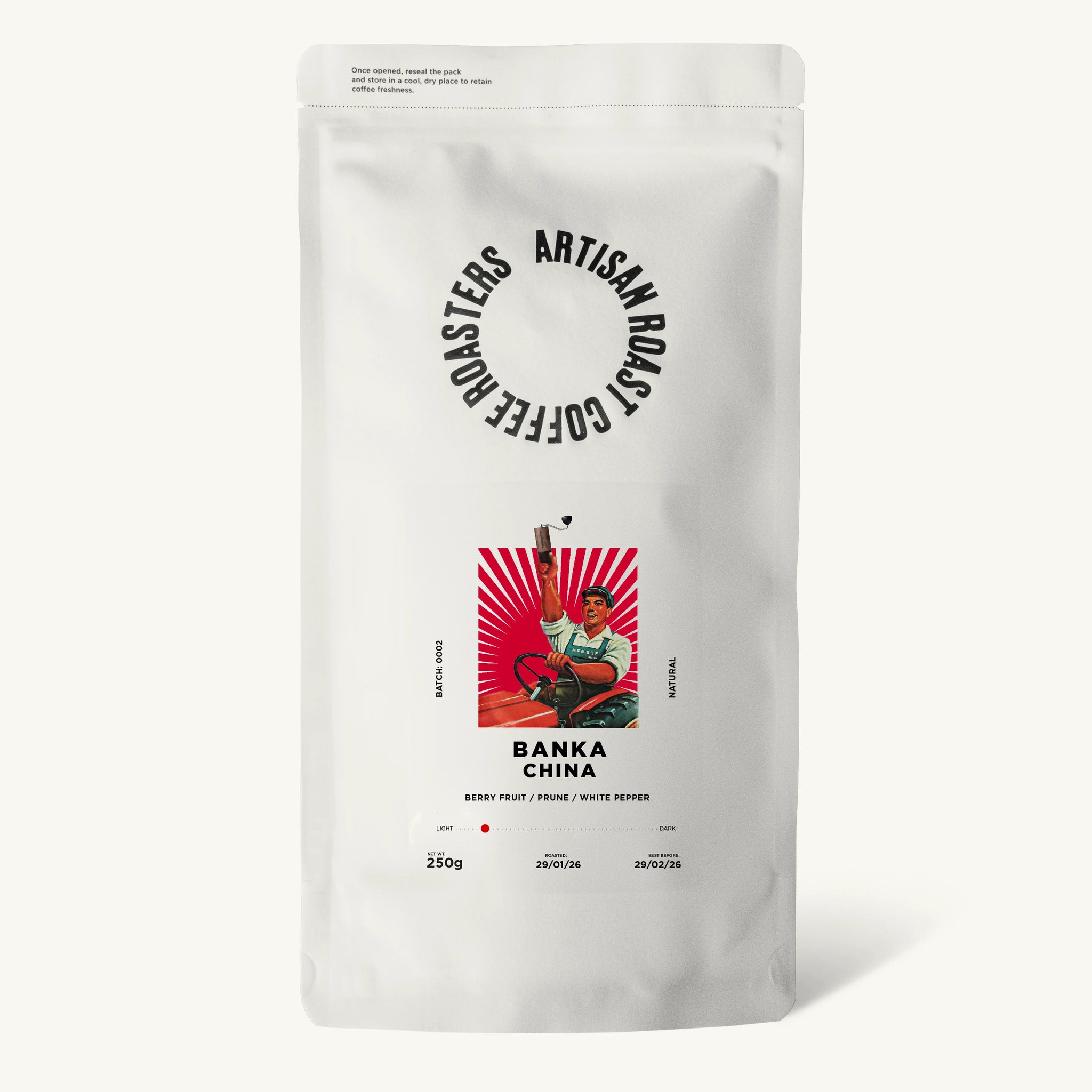 A light roast brings out the very best of Banka’s unique and expressive flavour profile. The extended fermentation has developed red berry and prune flavours, complemented by subtle winey notes and warming white pepper spice. A base of bakers chocolate and a syrupy texture create a balanced foundation. Over this a tangy candied lemon citrus acidity adds structure and length to the finish.